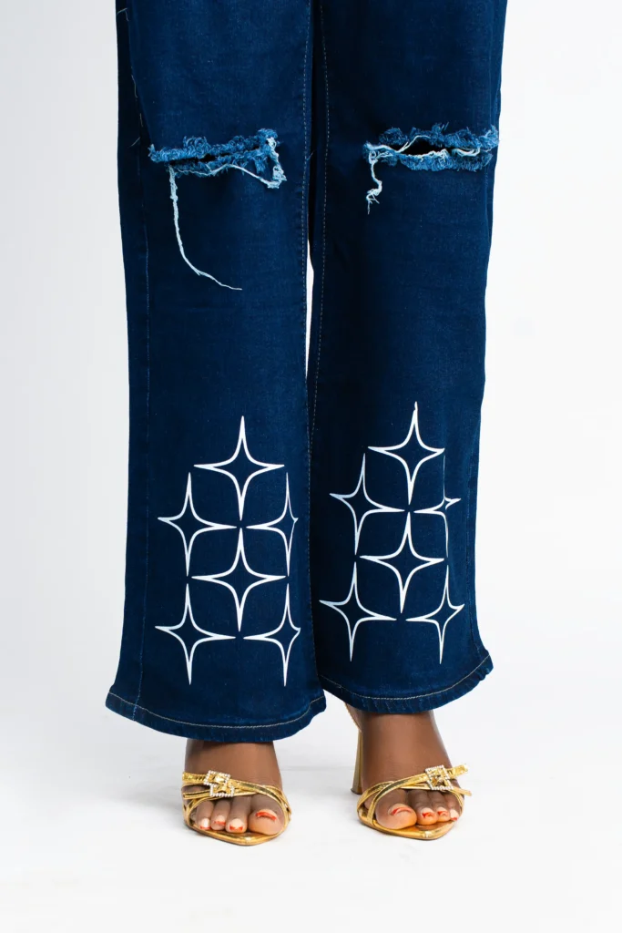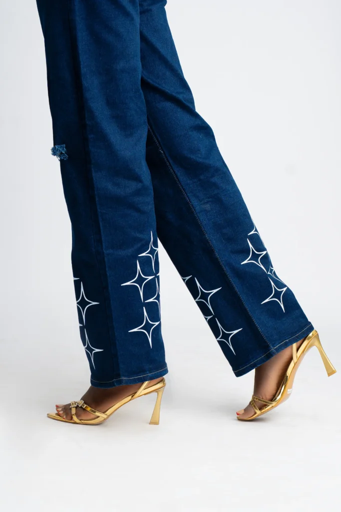 These aren’t just ripped jeans they’re a declaration. Featuring raw knee distressing and custom star graphics, they’re inspired by the idea that if you shoot for the moon, you might land among the stars. Bold, imperfect, and unapologetically ambitious.
